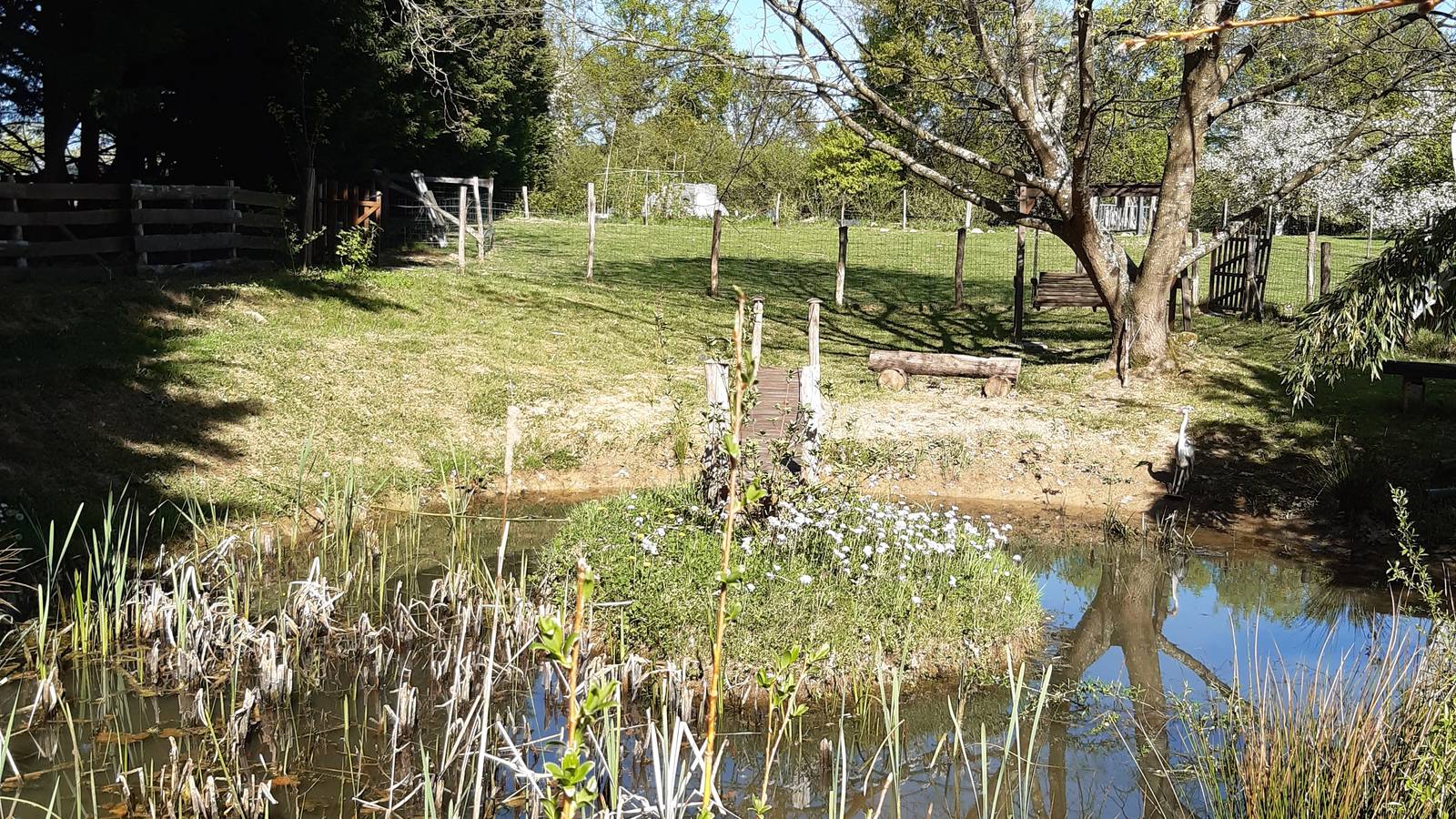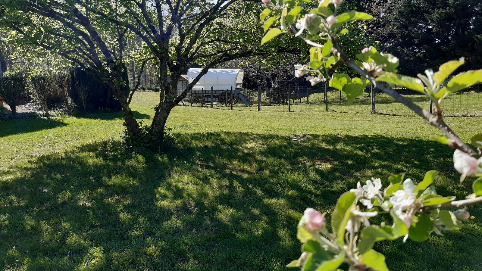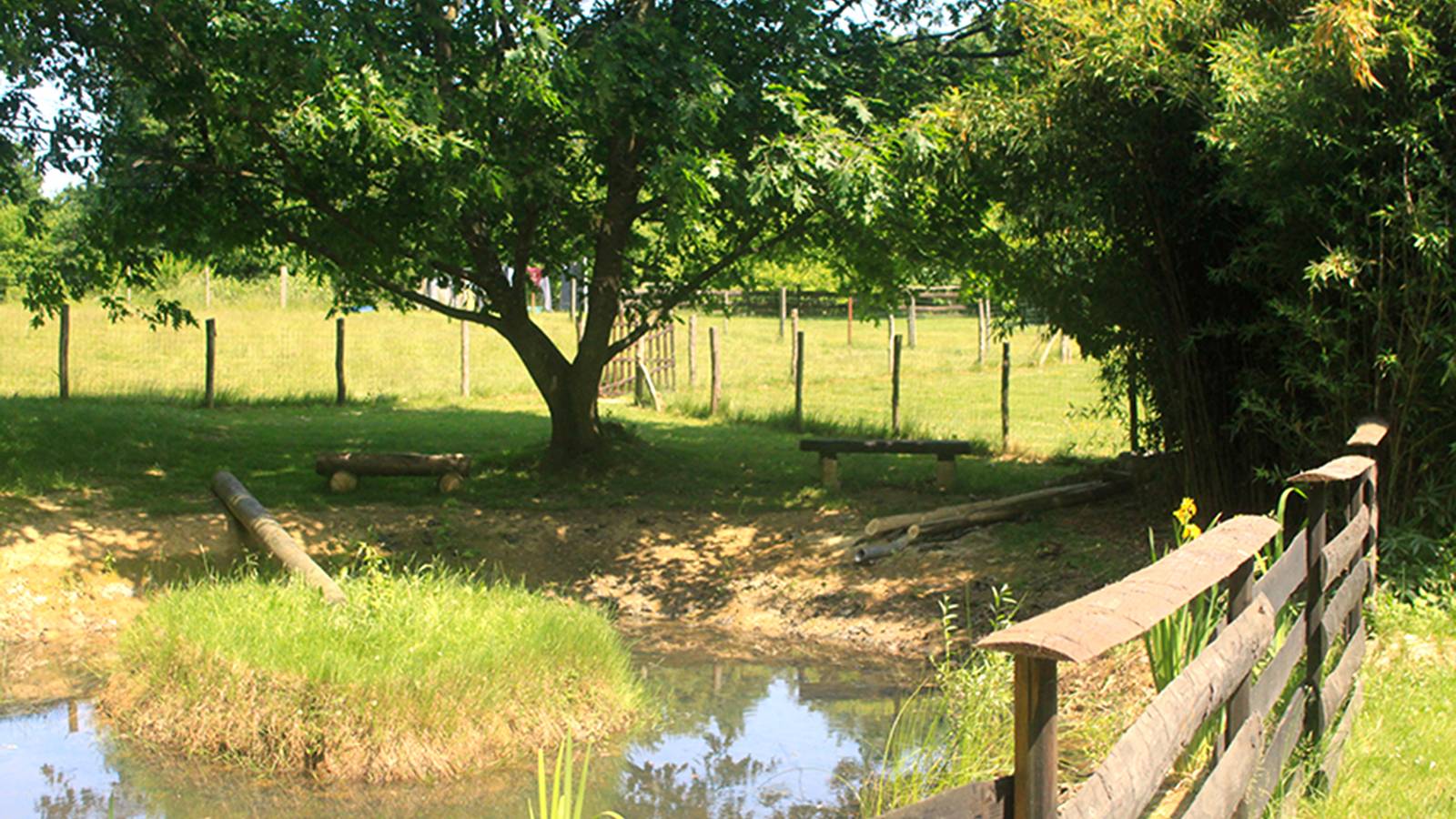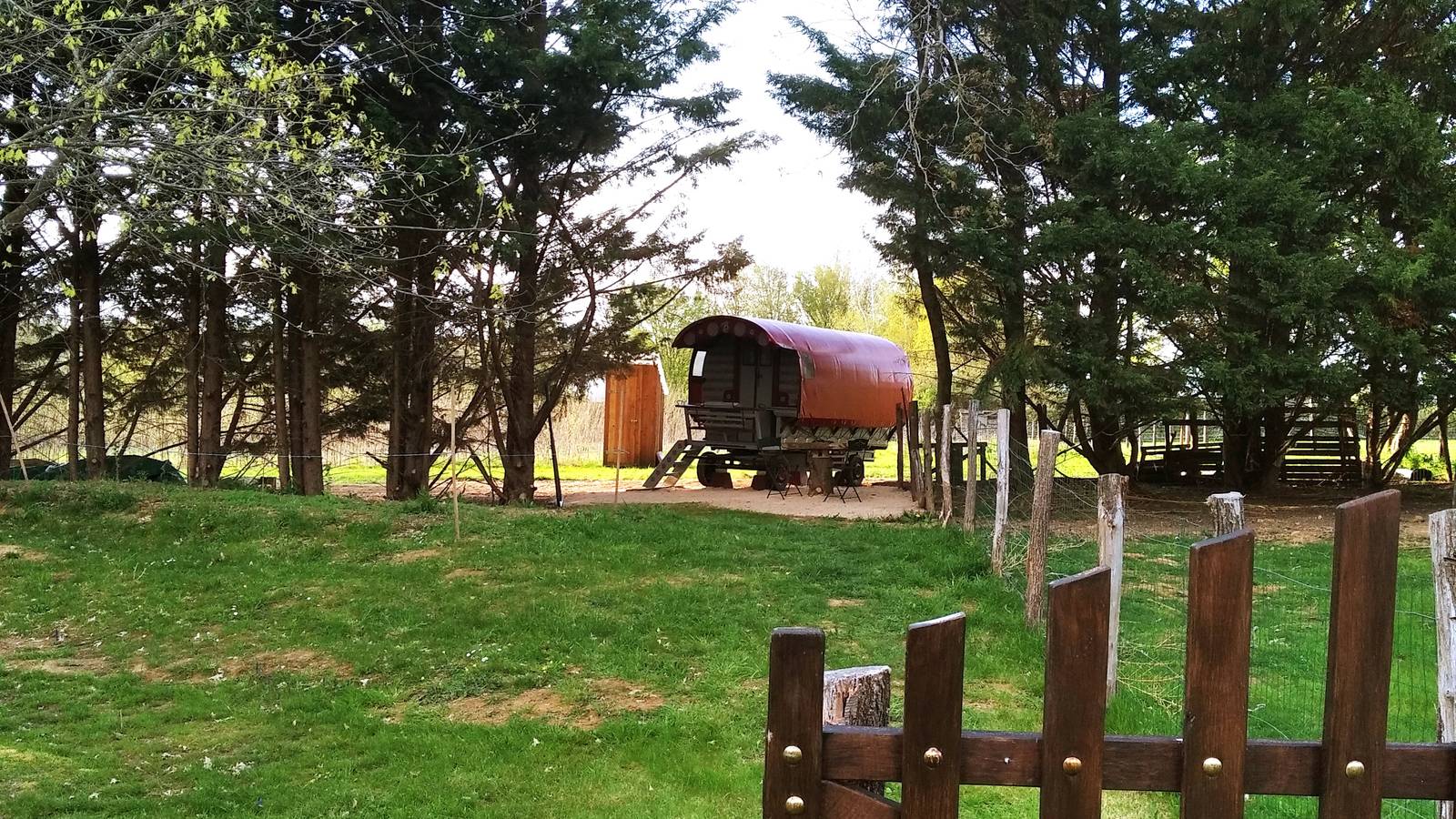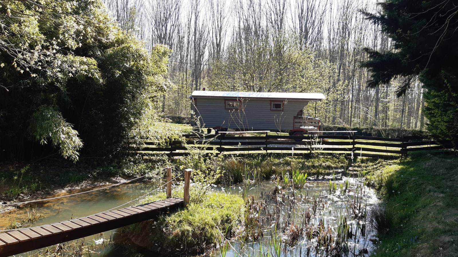 Du côté des accueils, nous disposons de deux roulottes, Esmé notre joyau construite par nos soins, basée sur le modèle des roulottes de directeurs de cirque des années 30 et Polly, une petite irlandaise hippomobile. Vous trouverez aussi une tente trappeur pour une immersion écologique et paisible dans notre environnement. Sa terrasse est idéale pour voir le ciel des nuits d'été... Notre trois logements sont agencés autour de notre mare pédagogique dans laquelle, pour les amoureux de la nature, vous pourrez adminrer tout un ecosystème typique de la Bresse.