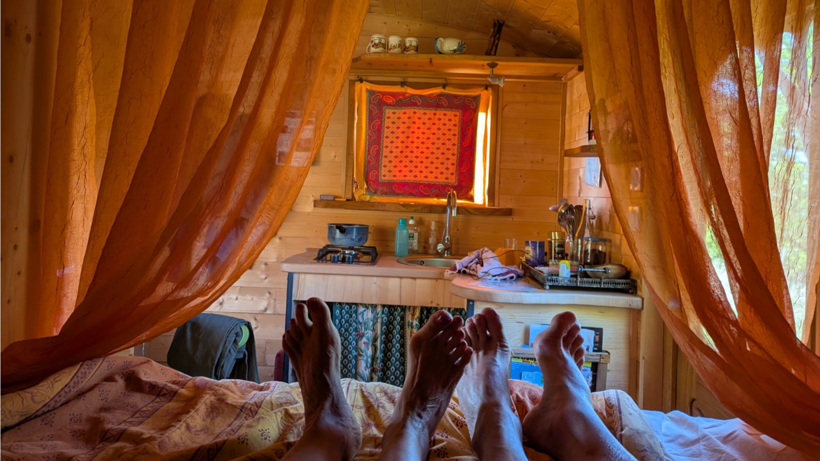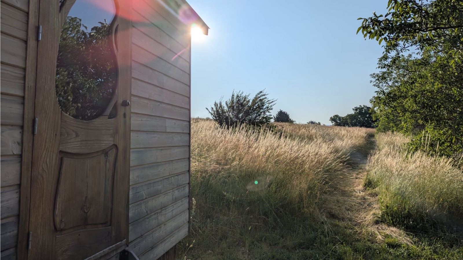 La roulotte fabriquée par un artisan local et aménagée par nos soins n'est connectée à aucun réseau collectif. Elle est équipée d'un éclairage 12 volts et d'une prise USB permettant de recharger tél portables et tablettes, alimentés par un panneau solaire. Pas de 220 v disponible ! L'eau provient de notre source et est chauffée par un système solaire. Les eaux usées sont recyclées via une phyto-épuration, merci de n'utiliser que des produits biodégradables !