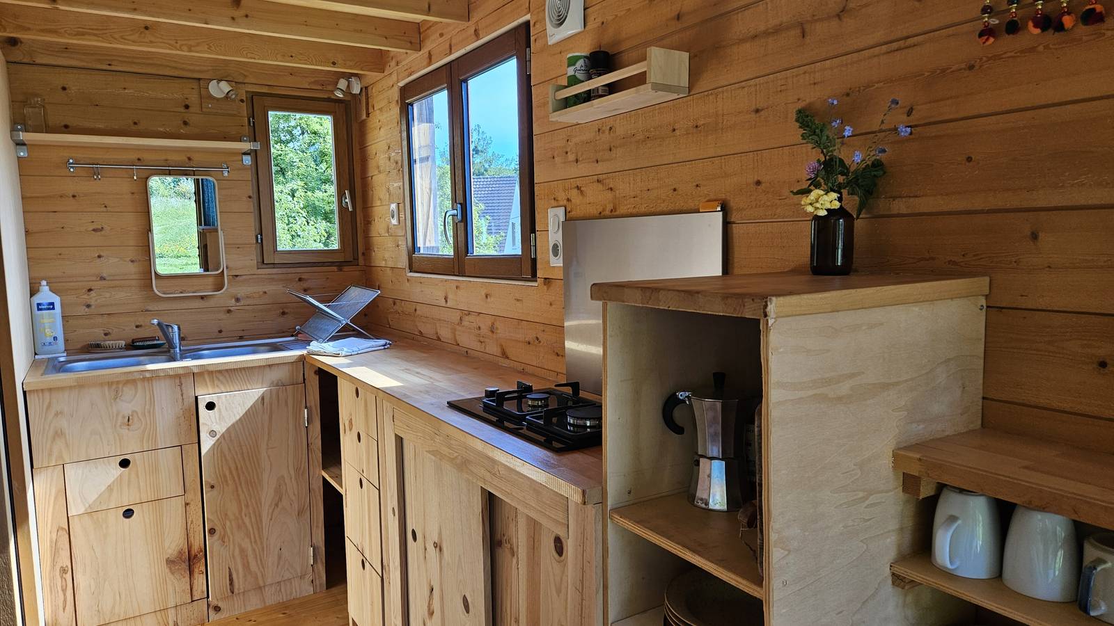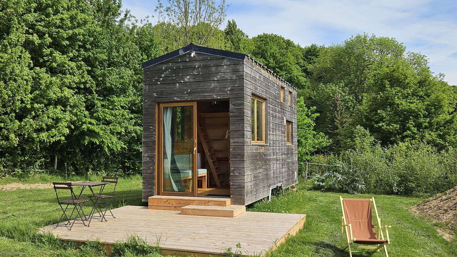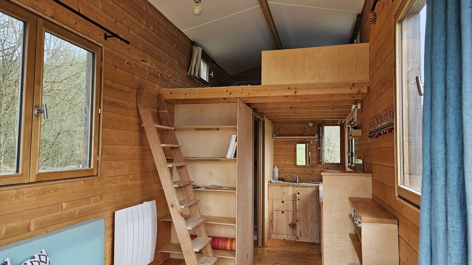 La tiny house est construite en ossature bois. Isolée de toute part avec un mélange de chanvre de lin et de coton. De grandes fenêtres et une grande baie vitrée donne l'impression d'être au milieu de la nature. Sur la mezzanine, se trouve un lit deux place. En bas la canapé se transforme en lit pour accueillir un ou deux enfants. Les toilettes sèches se trouvent à l'extérieur, sur la flèche de la remorque, pour plus d'intimité et de confort.