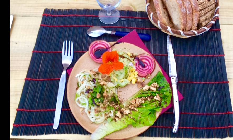Nous proposons (sur réservation) une cuisine végétarienne préparée principalement avec les produits de la ferme labellisés "Nature & Progrès", donc cultivés et produits sans AUCUN intrants chimiques. Merci de nous préciser à l'avance les besoins spécifiques (sans gluten ou allergies).