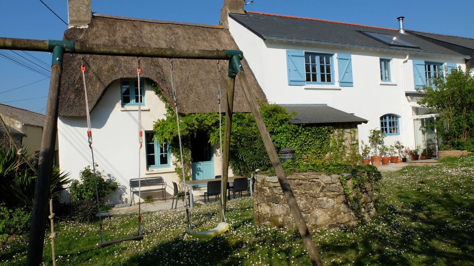 Il y a une terrasse avec salon de jardin, braséro, balançoire pour les enfants.