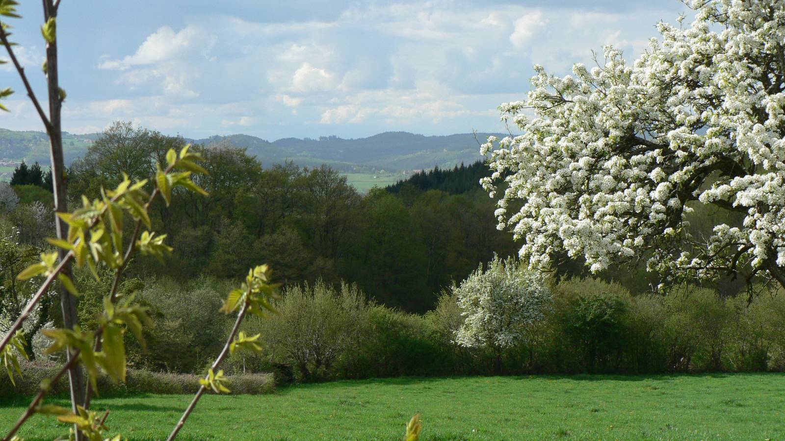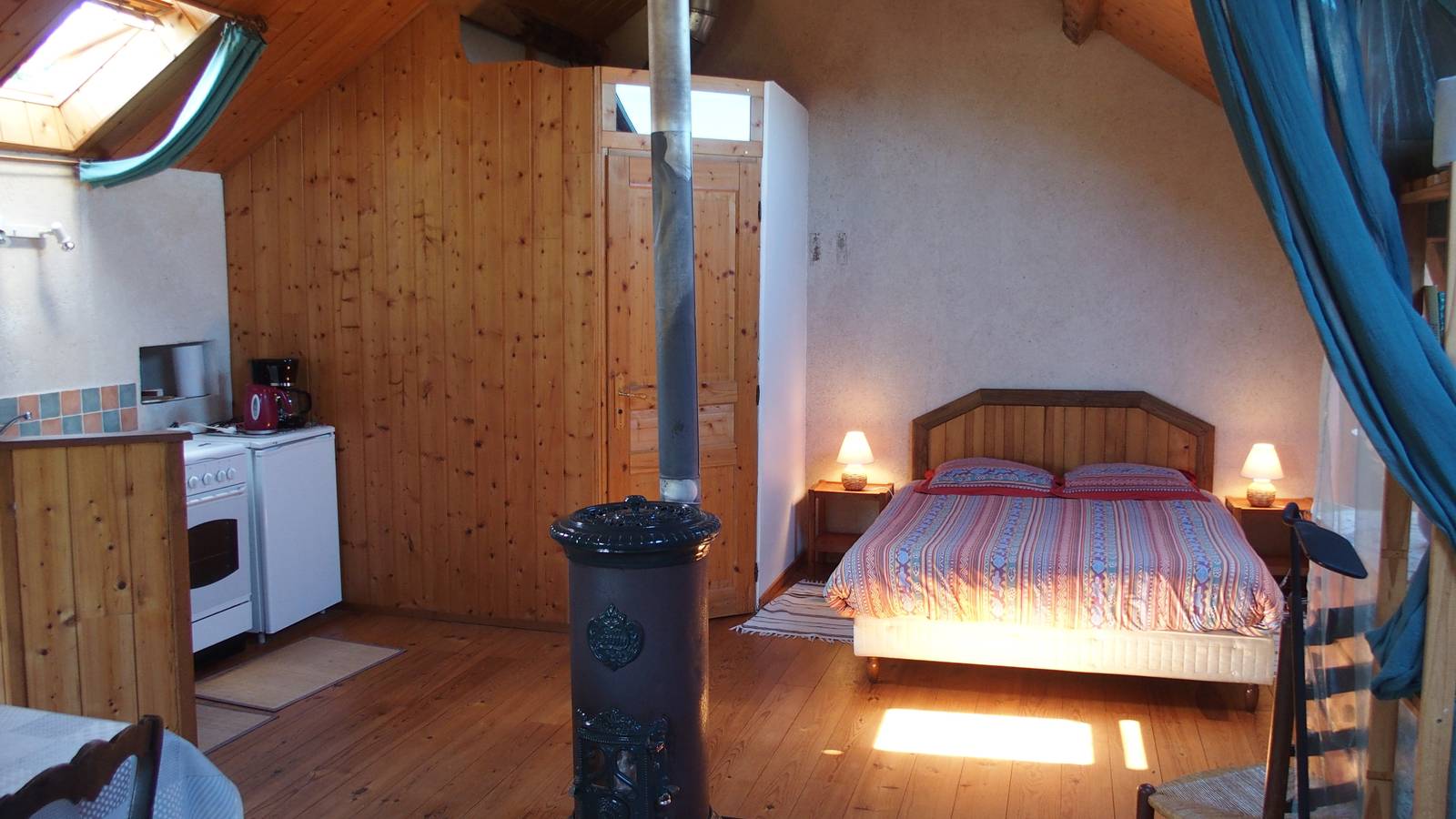 Gîte sur la ferme en pleine nature. Calme, repos et convivialité. Studio spacieux (40m²), conçu pour 2 ou 3 personnes (1 lit double + 1 lit simple), rénové avec des matériaux écologiques, coin cuisine, salle de bain avec douche et wc. Espace jardin-détente mis à disposition. Le gite est sur la ferme qui est toujours en agriculture biologique, avec des vaches Aubrac, nous sommes à présent retraités.