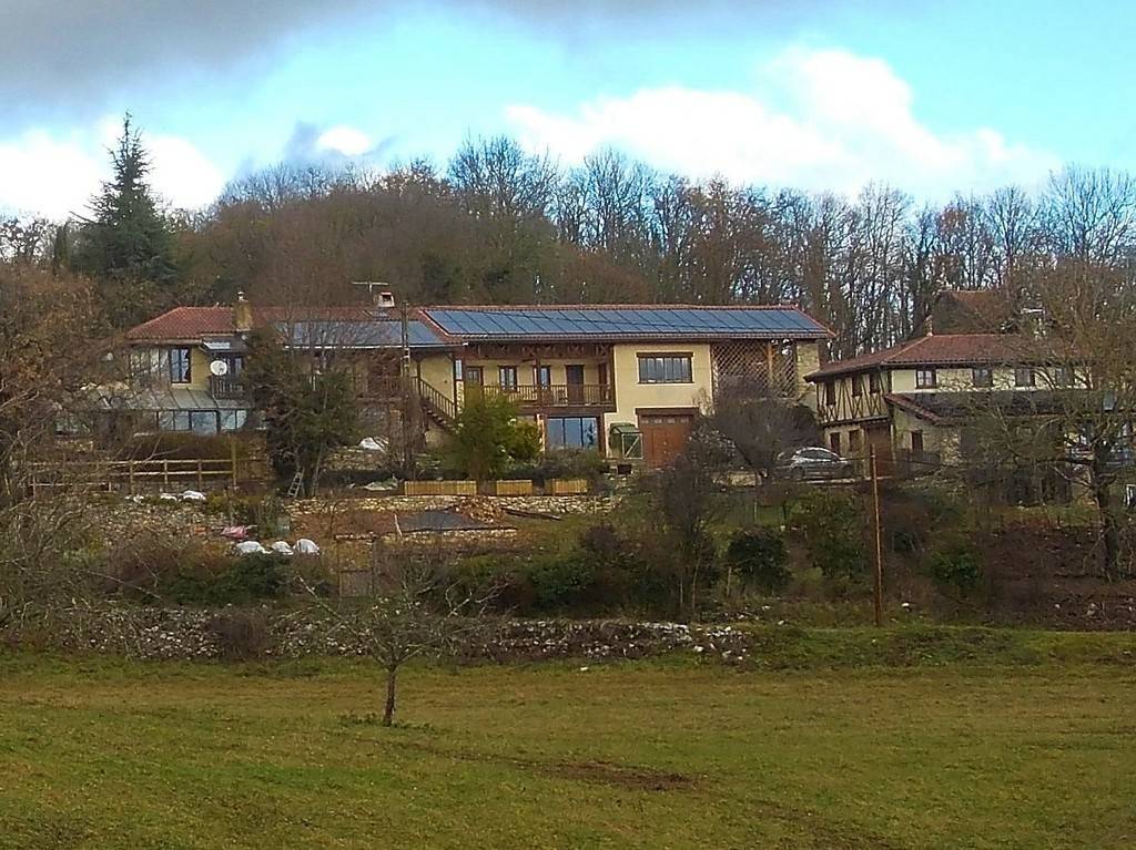Maison autonome : capteur solaire thermique et photovoltaïque, éoliennes , récupération des eaux pluviales vers la mare et le jardin, source, chauffage au bois.